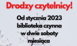 Drodzy czytelnicy! Od stycznia 2023 roku biblioteka czynna w dwie soboty miesiąca w godz. 8.00 – 13.00: